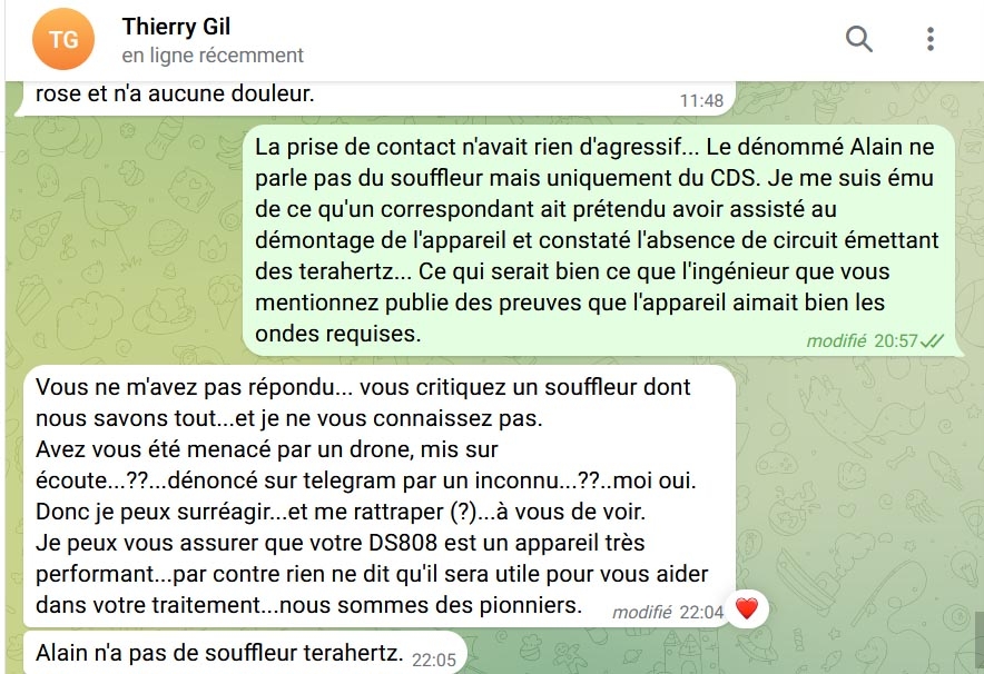 J'ai tenté de joindre Thierry Gil, je l'ai questionné par Telegram interposé. Or non seulement il n'a pas répondu à mon message il l'a effacé sur mon canal. Je trouve cette réaction très étrange ! D'autant plus qu'il a communiqué des témoignages de première main à une de mes connaissances.