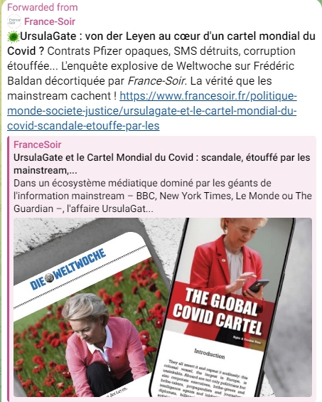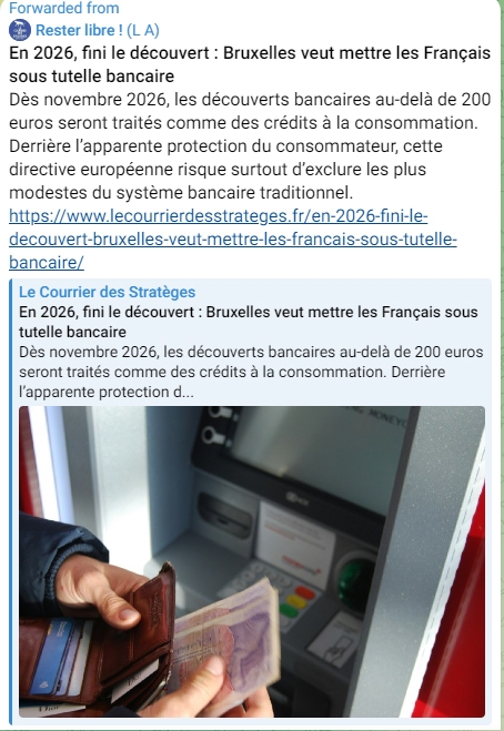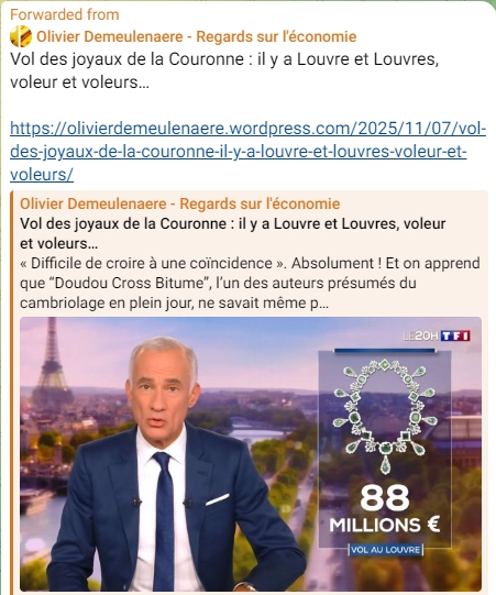 Enfin, le problème avec Telegram c'est que vous ne pouvez pas faire un copié/collé d'un post sinon élément par élément (photos, textes, vidéos séparément) et c'est dissuasif. Raison pour lesquelles j'ai eu recours, ci-après, à des photos d'écrans qui font que les liens deviennent inactif. L'avantage étant que l'on peut aborder certains sujets sans paraître en parler... Mais bon je n'ai pas l'intention de multiplier ce genre de revue d'actualités...