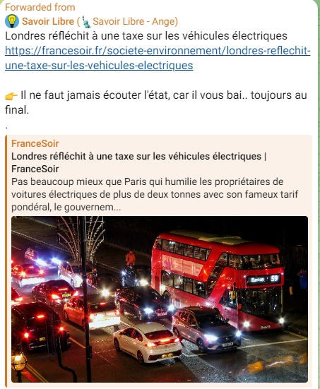 L'un des nombreux posts faisant état d'une montée des contestations quant à la mise hors la lois des véhicules "thermiques" et par extension de tout ce qui à un rapport avec la vogue de l'électricité verte. A noter que le Sieur Trump a dénoncé l'imposture de l'arnaque climatique mais il faut un expert tel Thierry Meyssan pour discerner que derrière son "cirque" du chaud et du froid alterné en direction de Moscou il existerait une volonté sincère voir efficace de neutraliser ce que l'on appelle Etat profond...