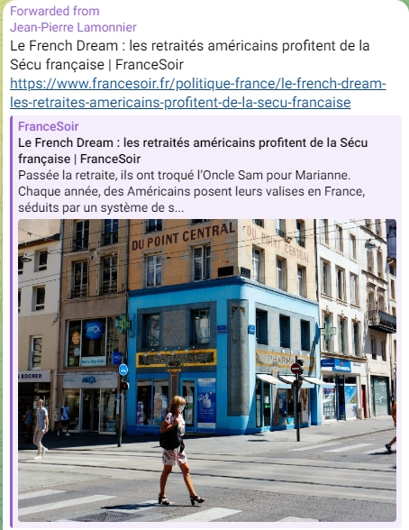 J'ai la conviction de perdre mon temps mais je continue car le seul moyen d'être informé c'est d'avoir sélectionné un certain nombre de canaux et de les parcourir aussi régulièrement que possible. Et ça ne coûte pas plus cher "forwarder" les posts qui m'ont paru pertinent moyennant, dans quelques cas, une paire de ligne à titre de résumé/commentaire... Donc je continue !